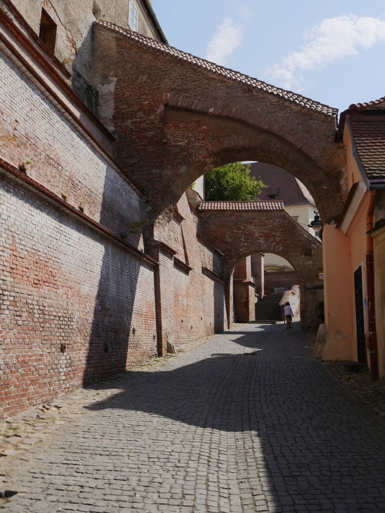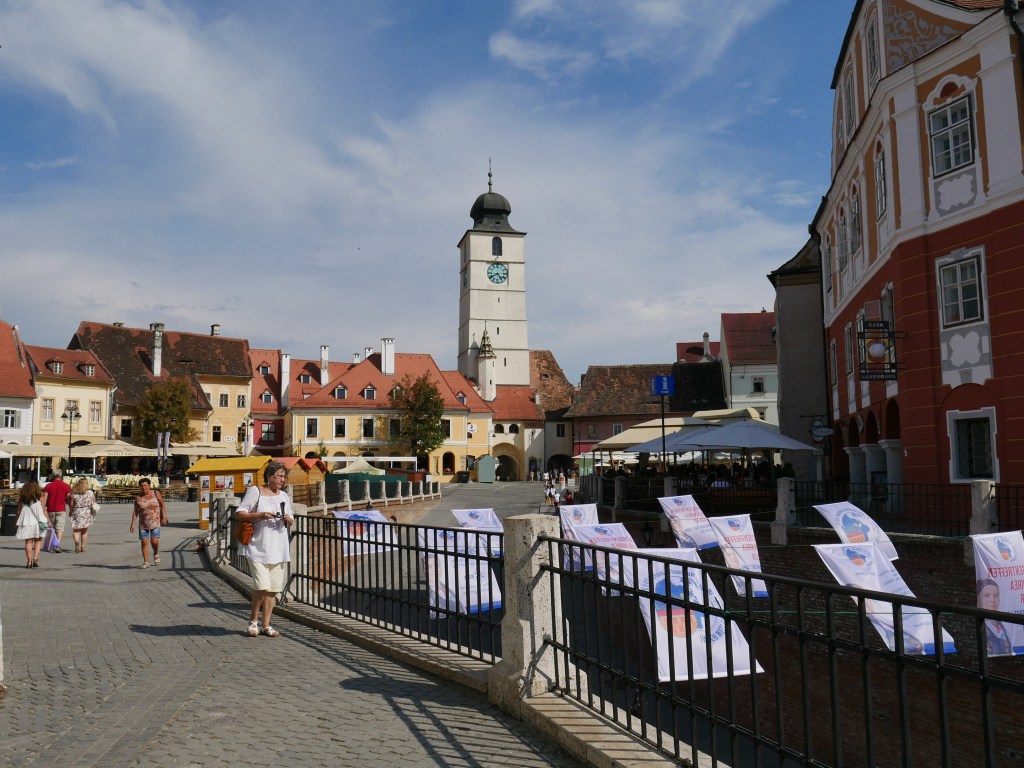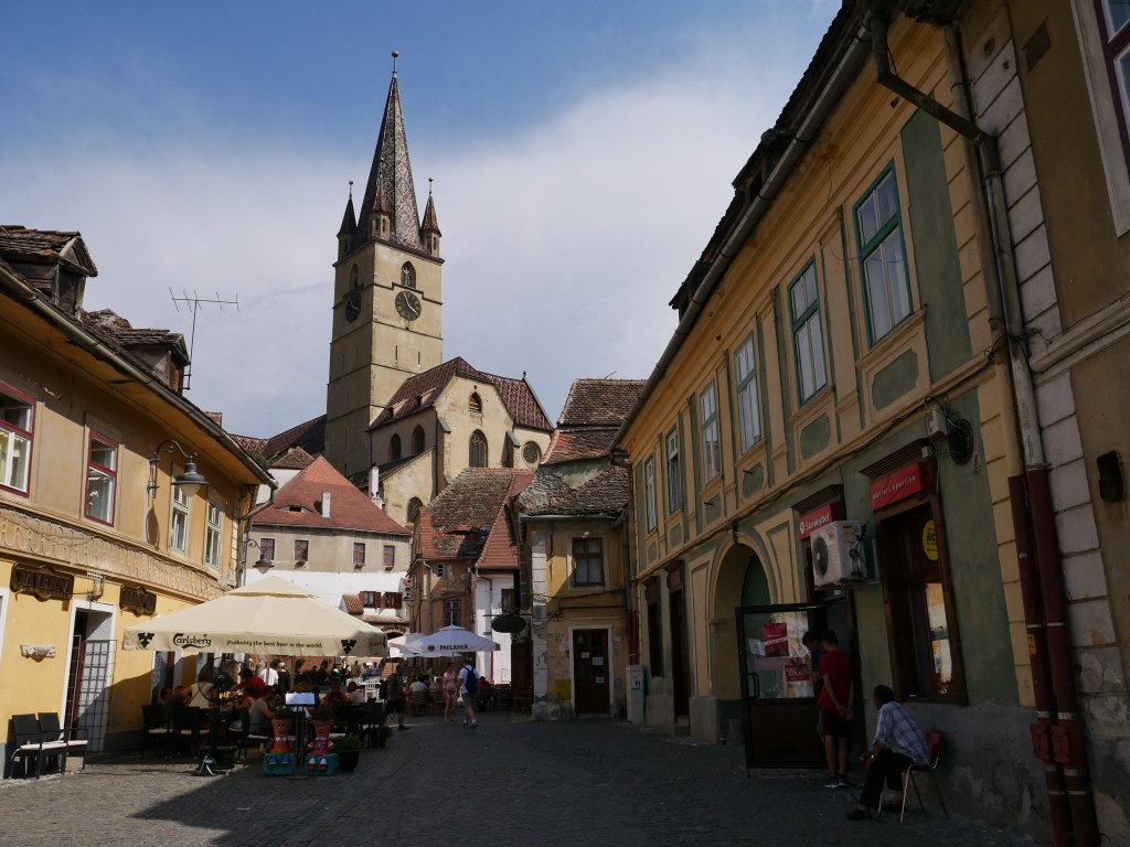 Après ce grand bol d’air frais, direction le centre-ville de Sibiu, divisé en une ville haute et une ville basse, en milieu d’après-midi. La ville est très agréable, nous arrivons par la ville basse (Orasul de jos) en découvrant quelques bâtiments médiévaux et le passage des Escaliers qui relie la ville basse à la ville haute par la toute petite place. La ville haute (Orasul de sus) s’organise autour des trois places historiques : la toute petite place, la petite place et la grande place – dans le genre noms faciles, on fait pas mieux !